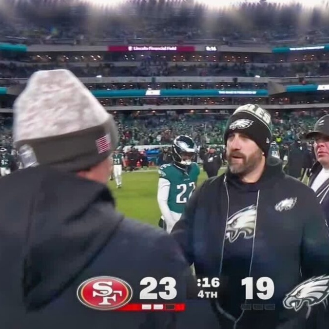 Following the Eagles’ frustrating 23–19 home loss to the San Francisco 49ers, cameras caught Sirianni sharing a brief exchange with 49ers head coach Kyle Shanahan during their postgame handshake. As the two coaches crossed paths, Sirianni could be heard telling Shanahan, “Go win it all.”